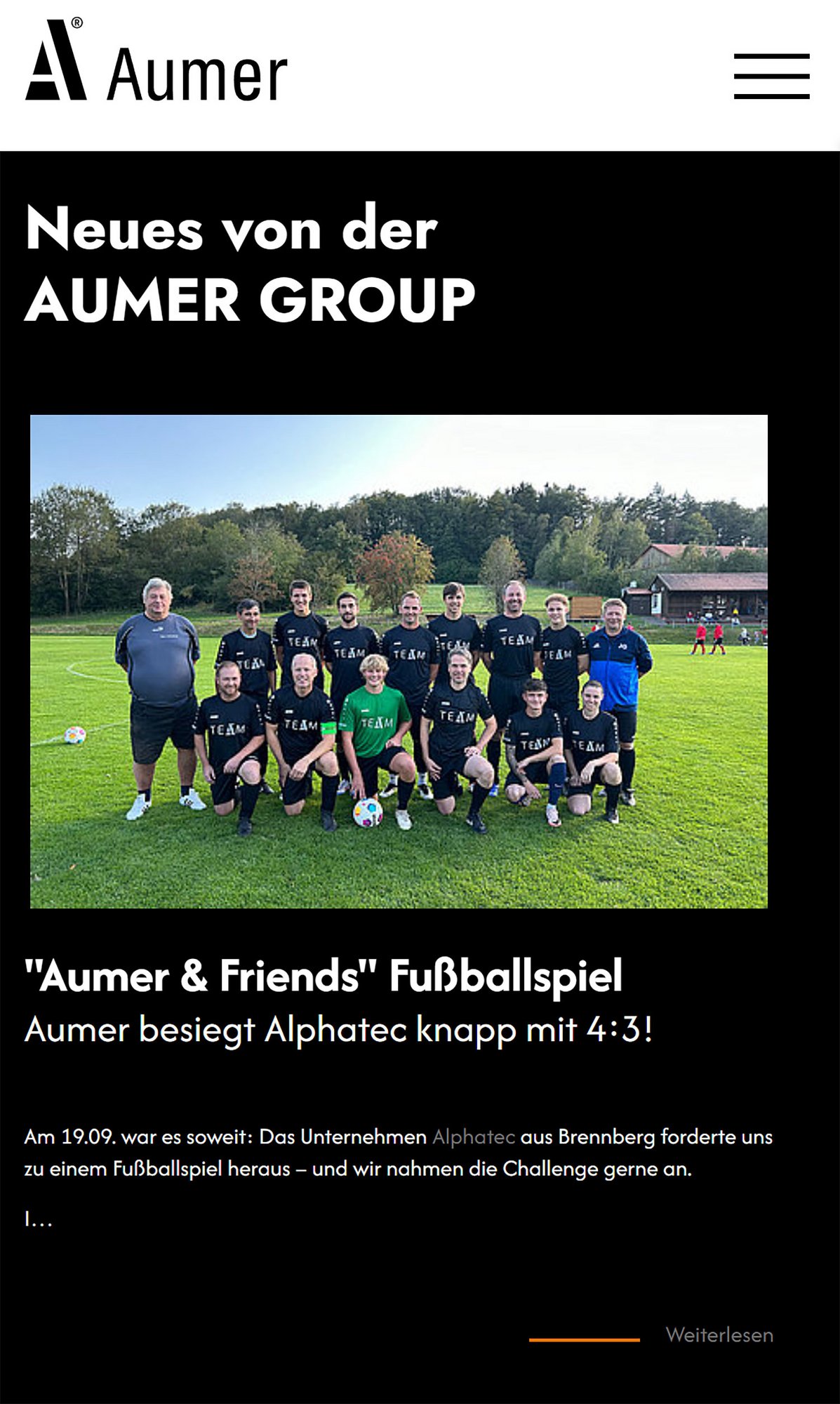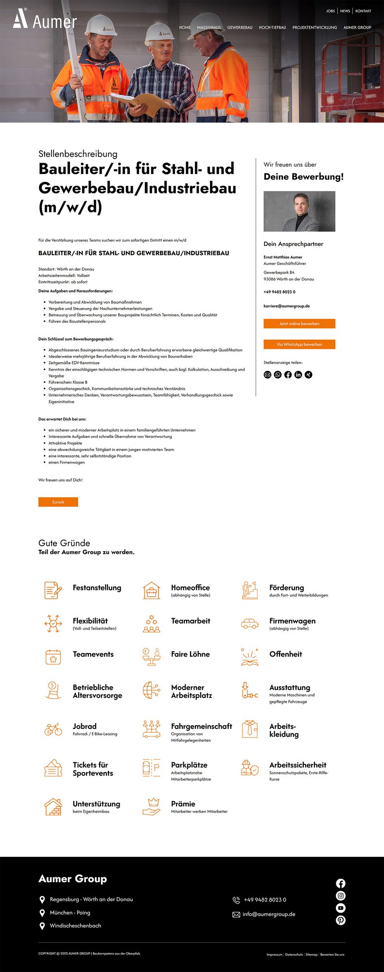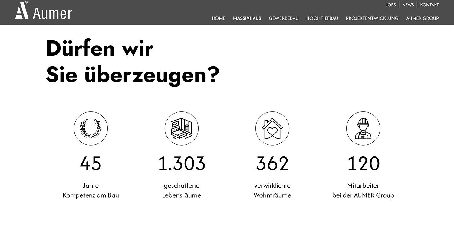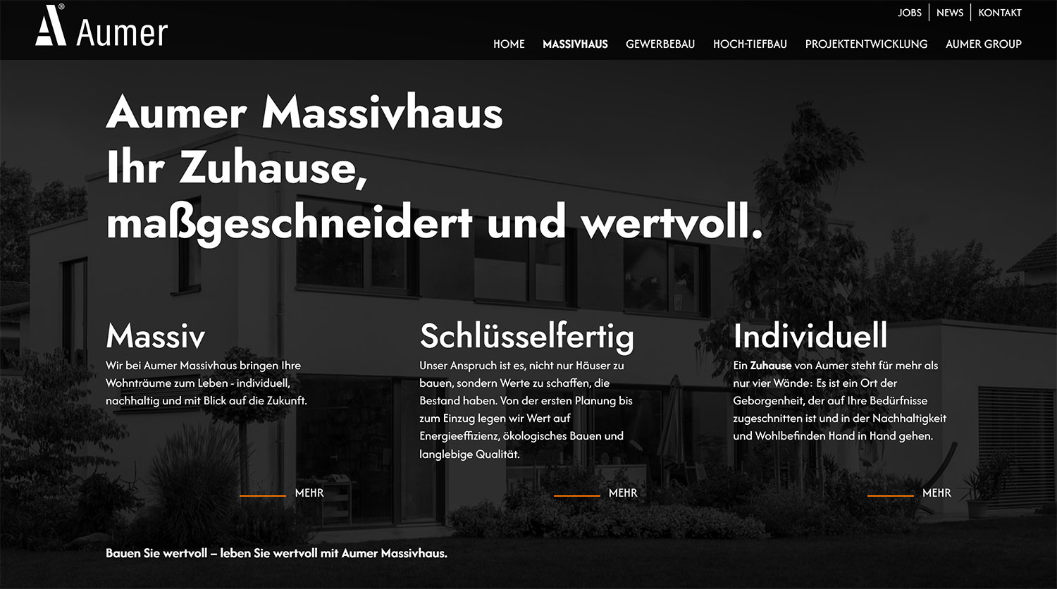 Die Aumer Group mit Sitz in Wörth an der Donau ist ein mittelständisches Bauunternehmen, das in den Bereichen Massivhausbau, Gewerbebau, Hoch- und Tiefbau sowie Projektentwicklung tätig ist. Mit über 120 Mitarbeitern setzt das Unternehmen auf Qualität und Nachhaltigkeit und realisiert nachhaltige Massivhäuser, Gewerbeobjekte und Infrastrukturprojekte.