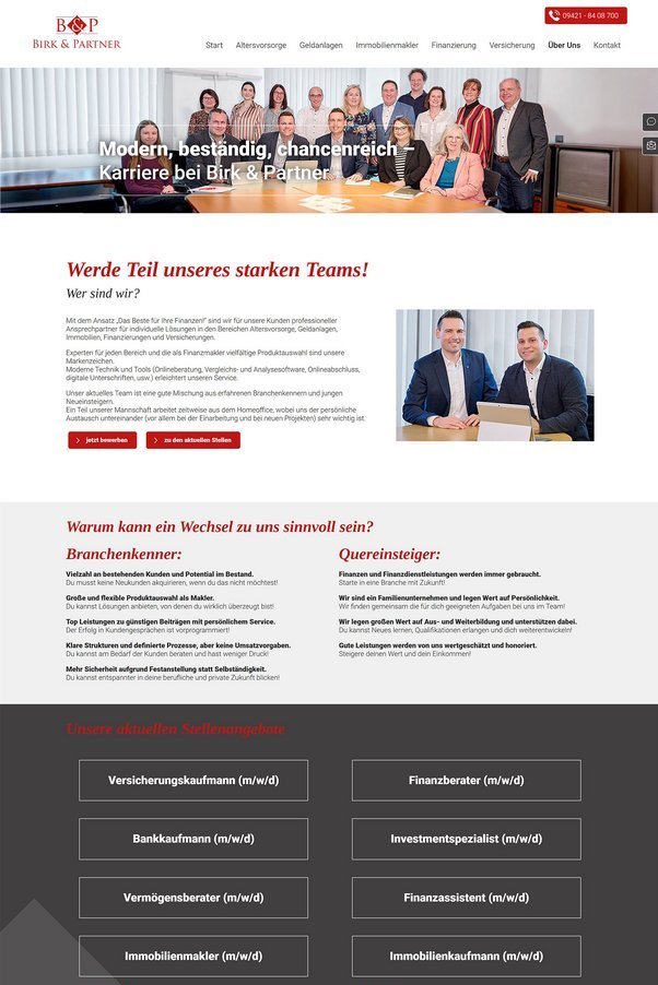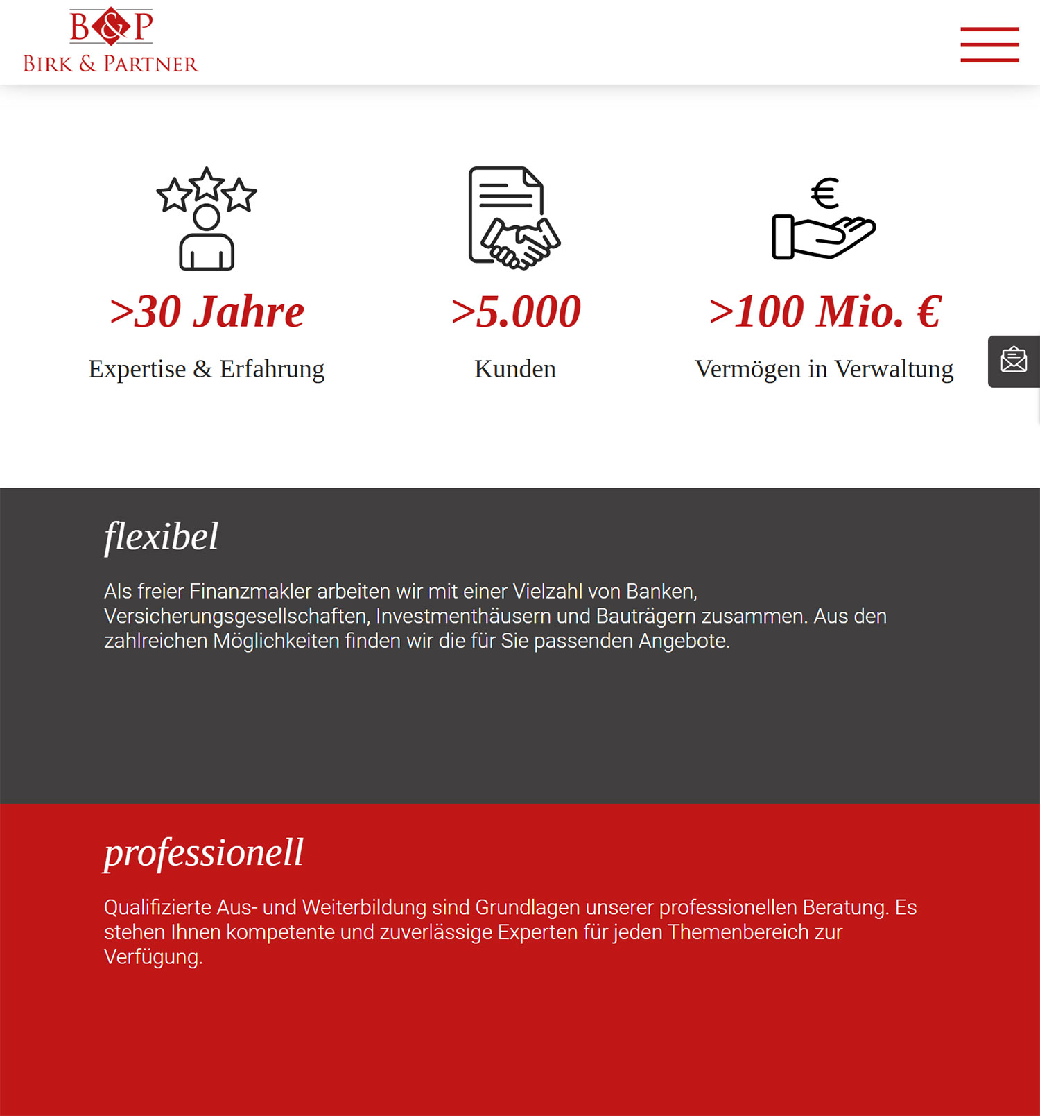 Experten für jeden Bereich und die als Finanzmakler vielfältige Produktauswahl sind das Markenzeichen von Birk & Partner.