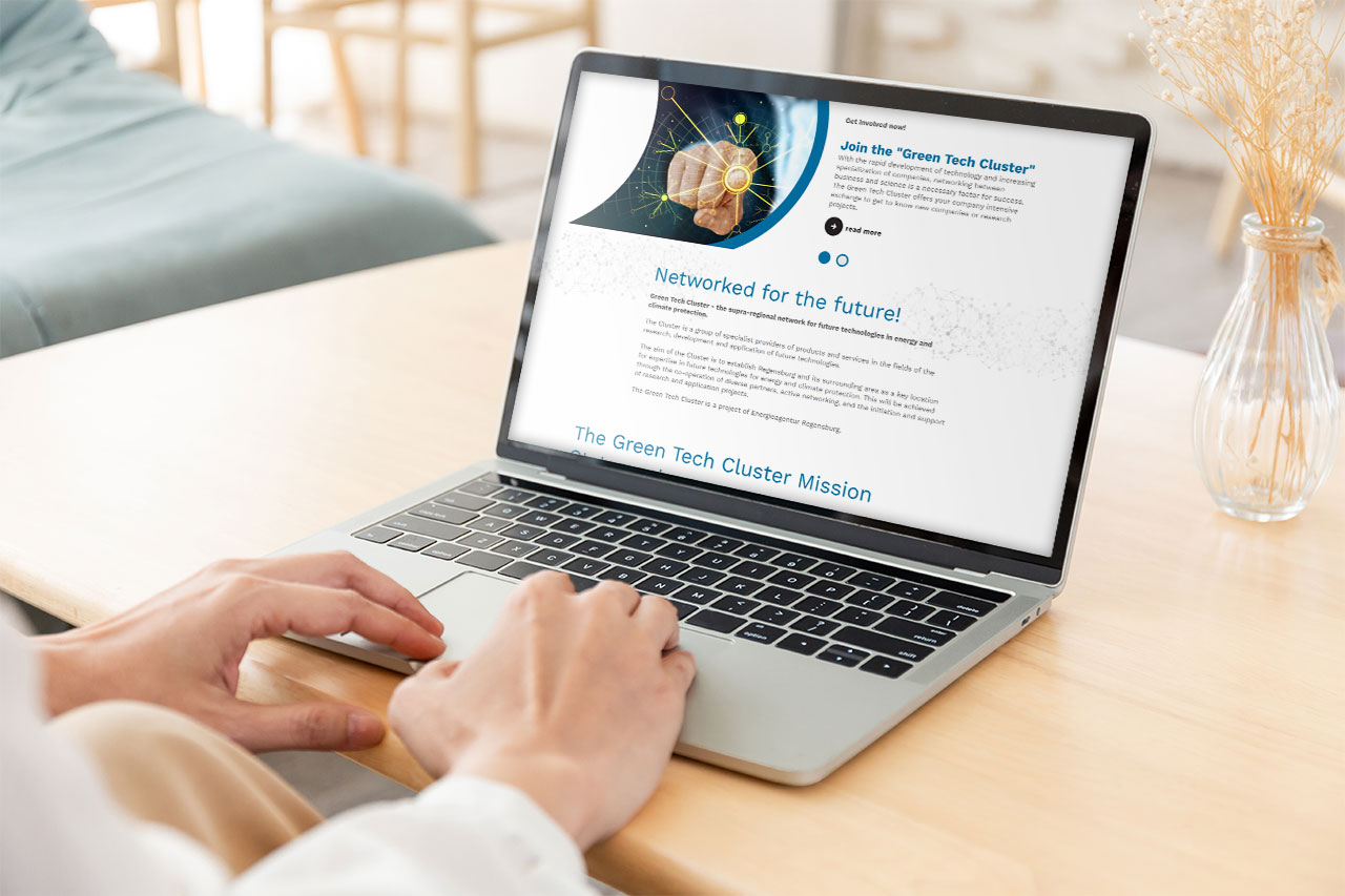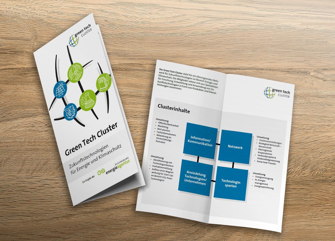 Im Bereich Corporate Design haben wir den Außenauftritt des ersten Bayerischen Energie-Bildungszentrums um:welt entwickelt; außerdem das Logo und Erscheinungsbild des Regensburger Greentech Clusters.