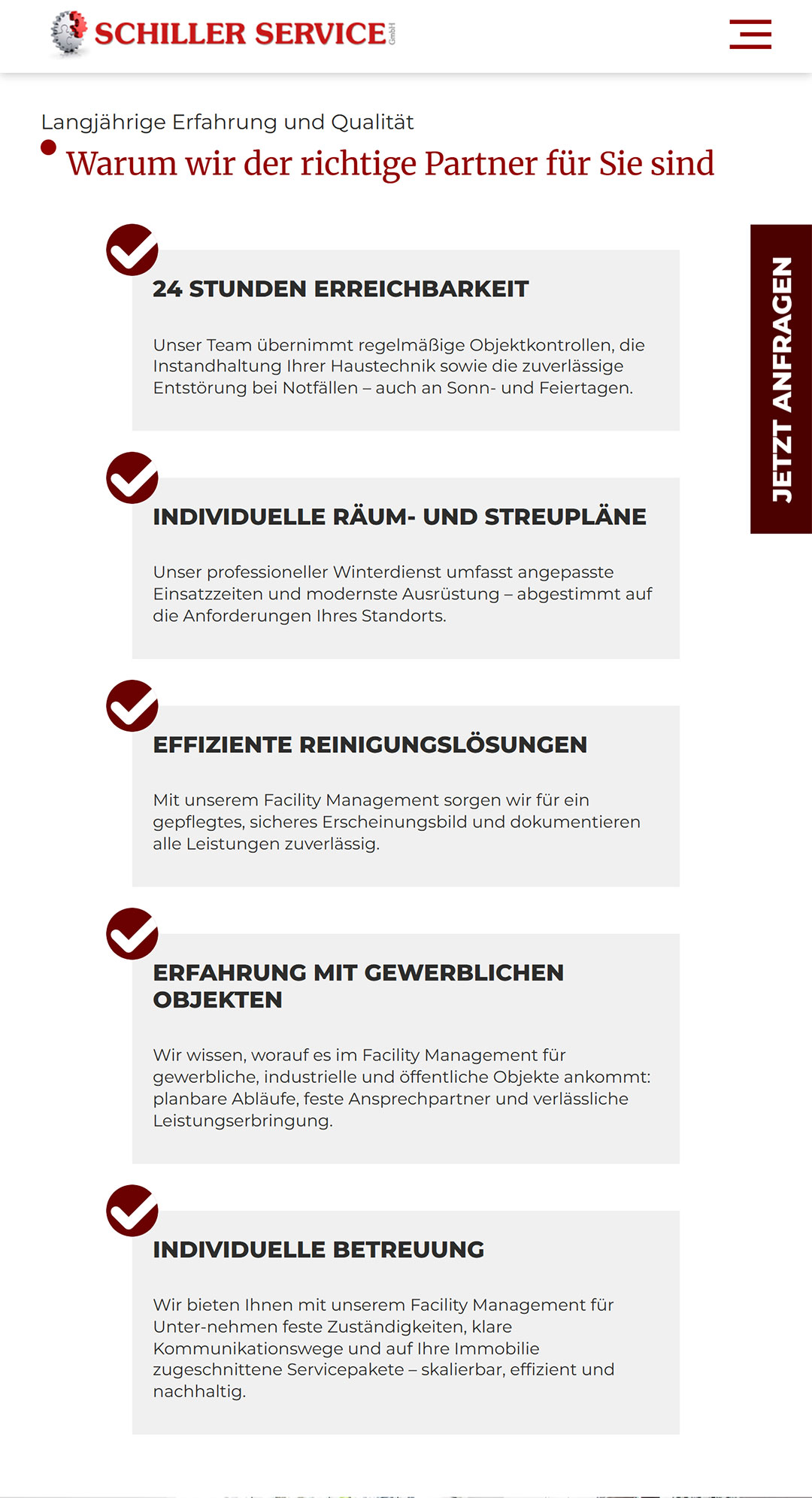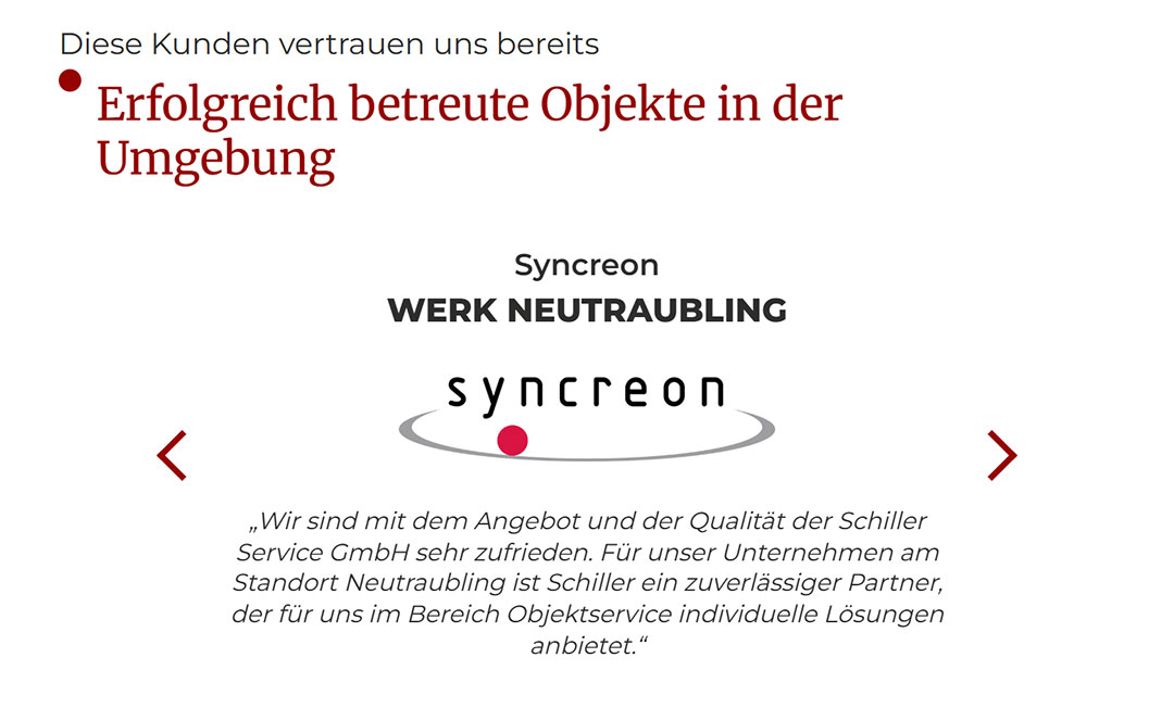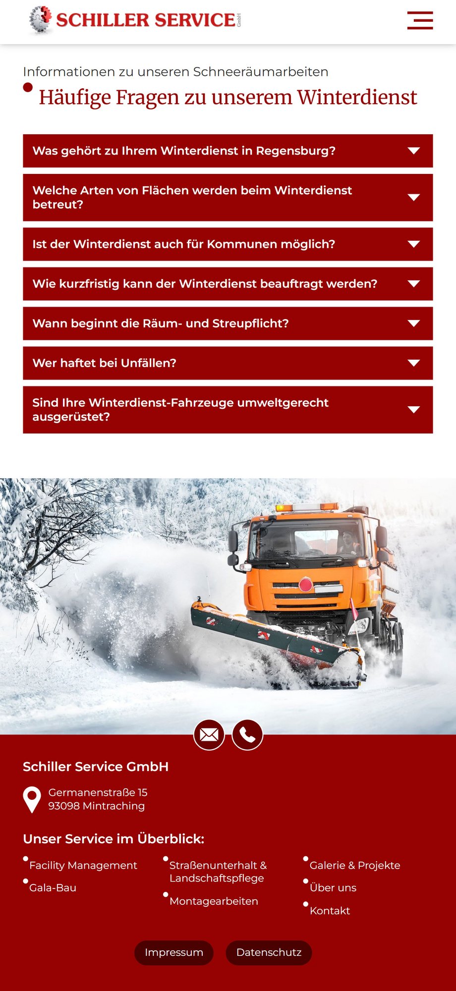Die Schiller Service GmbH in Mintraching bei Regensburg ist ein Dienstleistungsunternehmen rund um Gebäudemanagement, Garten- und Landschaftspflege sowie Winterdienst. Das Unternehmen bietet umfassende Services in den Bereichen Hausmeisterservice, Reinigung, Außenanlagenpflege und Montagearbeiten. Qualität, Zuverlässigkeit und individuelle Betreuung stehen dabei im Mittelpunkt – für private, gewerbliche und öffentliche Kunden in der Region Regensburg und darüber hinaus.