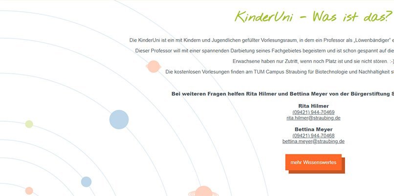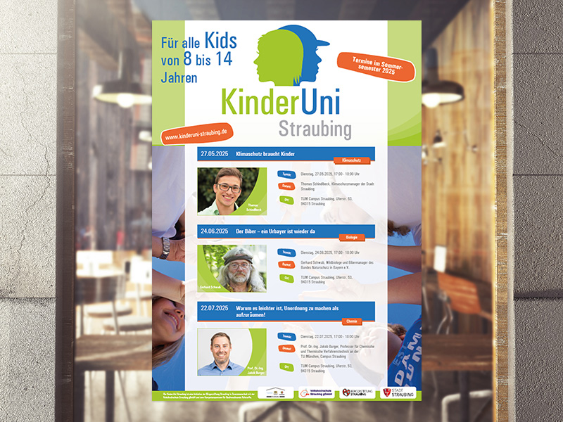 Die KinderUni Straubing ist eine Initiative, die Kindern im Alter von 8 bis 14 Jahren auf unterhaltsame Weise wissenschaftliche Themen näherbringt. In regelmäßigen Vorlesungen, die von Expertinnen und Experten verschiedener Fachrichtungen gehalten werden, entdecken junge Teilnehmende spannende Inhalte aus Naturwissenschaft, Technik und Gesellschaft.