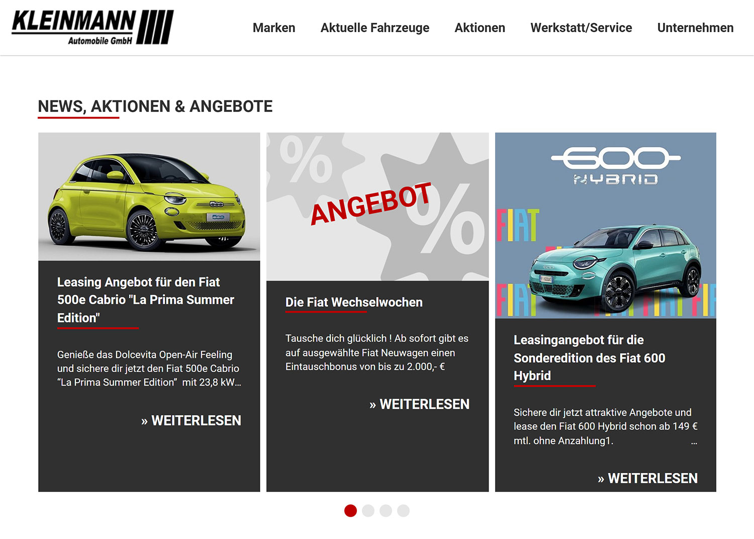 Die Kleinmann Automobile GmbH in Pforzheim ist Vertragspartner für Fiat, Fiat Professional, Mitsubishi und ORA GWM und Servicepartner für Abarth und Jeep. Das Unternehmen bietet Neu- und Gebrauchtwagen, attraktive Leasingangebote sowie einen umfassenden Werkstattservice – inklusive persönlicher Beratung und Videoberatung.