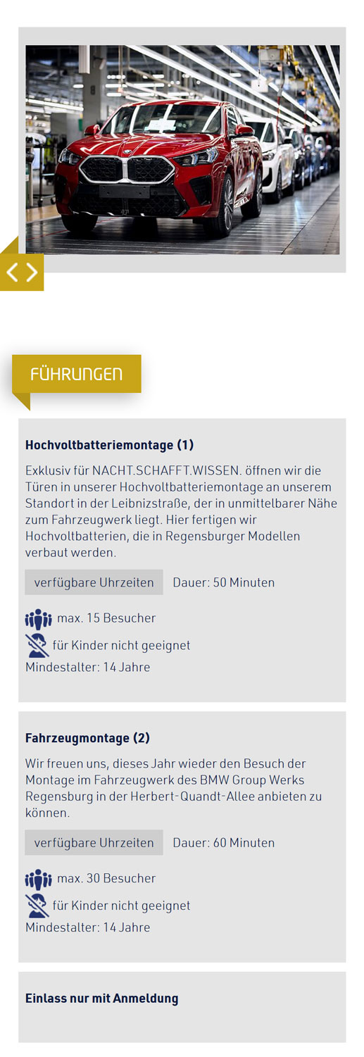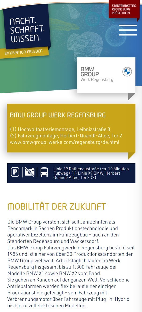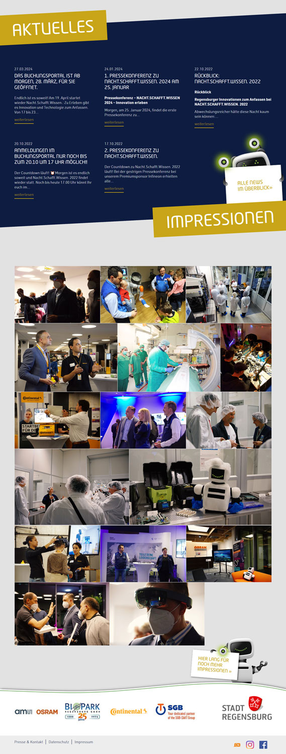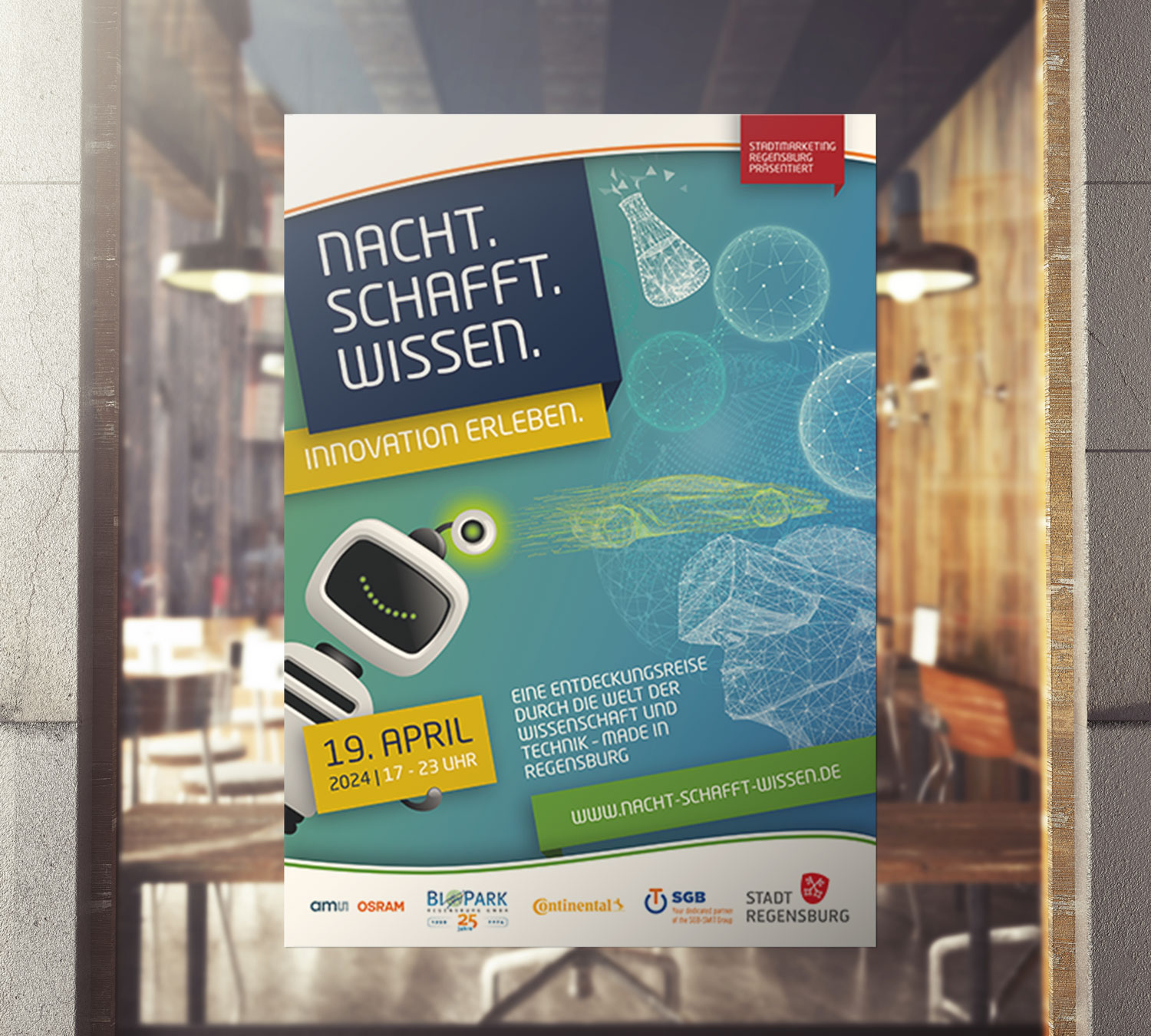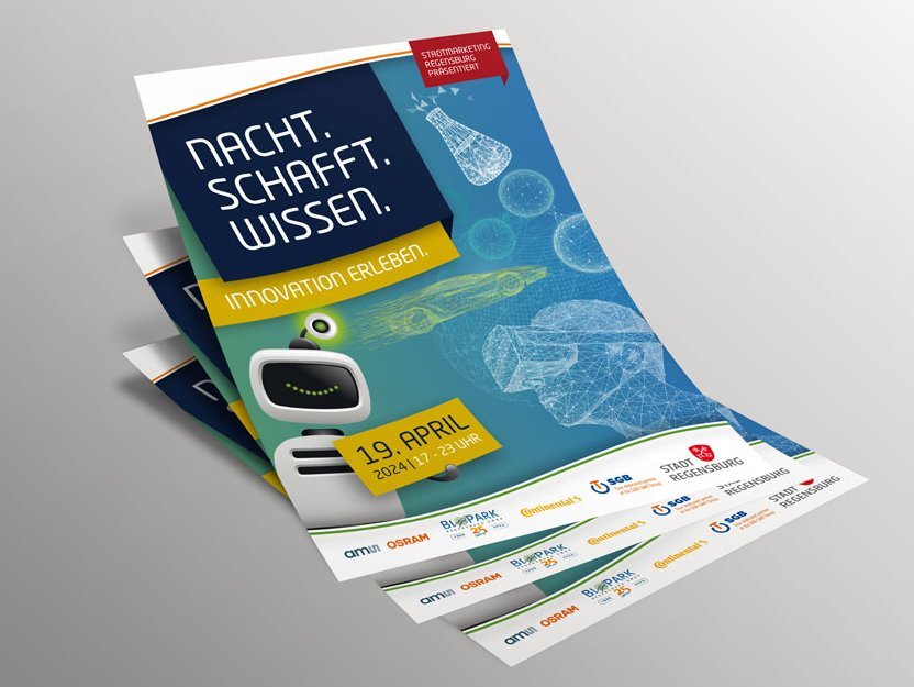 Alle zwei Jahre lädt das Stadtmarketing ein, die Forschungs- und Technologielandschaft Regensburgs bei Nacht.Schafft.Wissen. zu erkunden. Die Arbeit in den Laboren und Werkhallen und die Vielzahl technischer Highlights bleibt der Öffentlichkeit meist verborgen. Nacht.Schafft.Wissen. ermöglicht es allen Interessierten, Einblicke in die Arbeit ansässiger Unternehmen zu gewinnen.