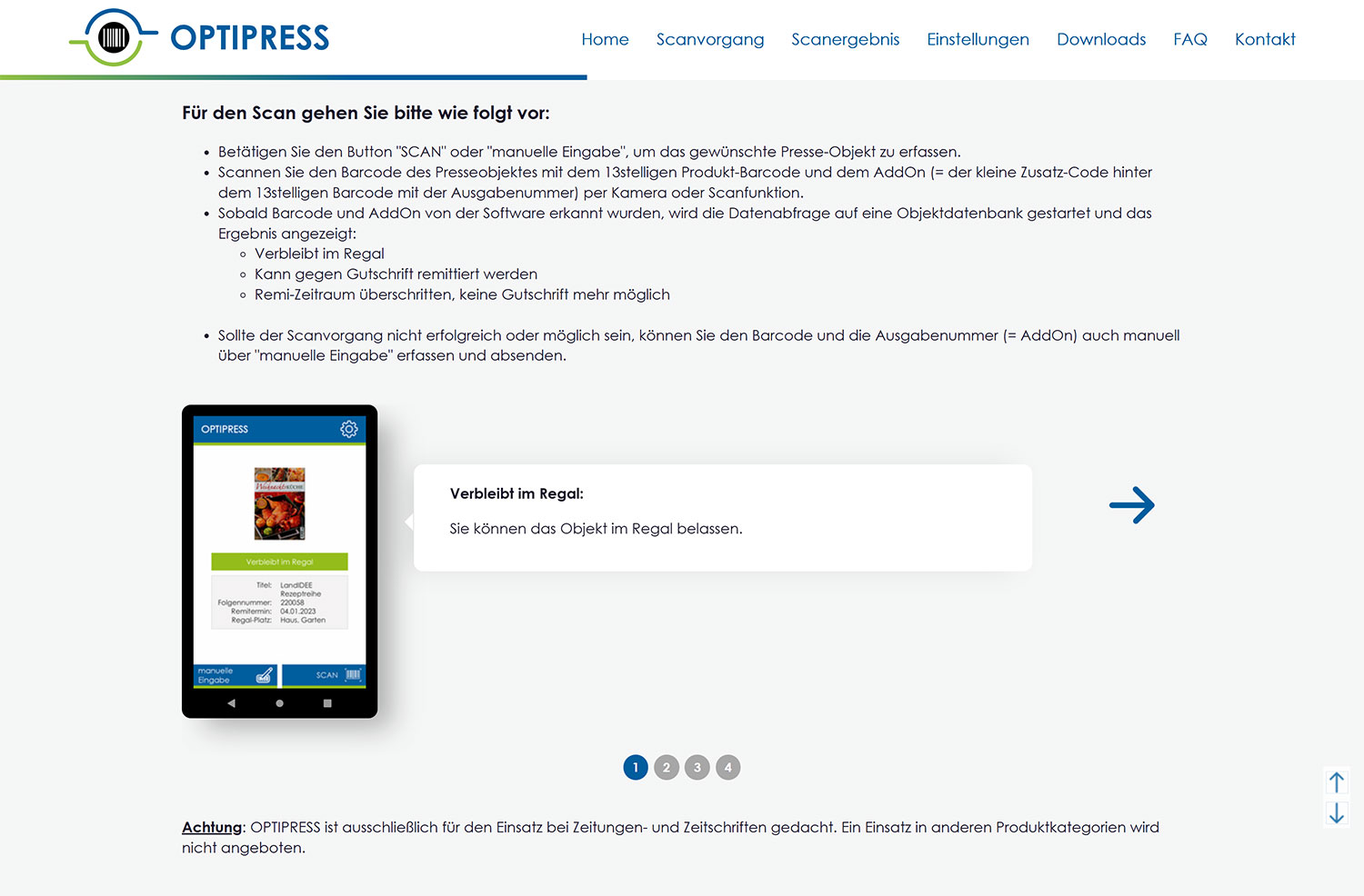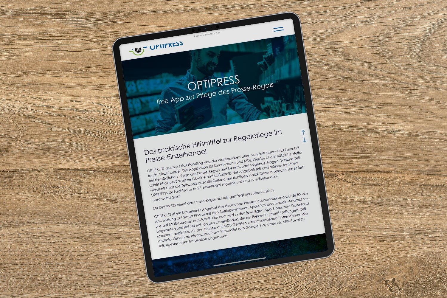 OPTIPRESS optimiert das Handling und die Warenpräsentation von Zeitungen und Zeitschriften im Einzelhandel. Die App für Smartphones und MDE-Geräte ist der nützlicher Helfer bei der täglichen Pflege des Presse-Regals und beantwortet folgende Fragen: Welche Zeitschriften sind aktuell? Welche Objekte liegen außerhalb der Angebotszeit und müssen remittiert werden? Befindet sich die Zeitschrift oder Zeitung am richtigen Platz? Diese Informationen liefert OPTIPRESS für Fachkräfte am Presse-Regal tagesaktuell und in Millisekunden.