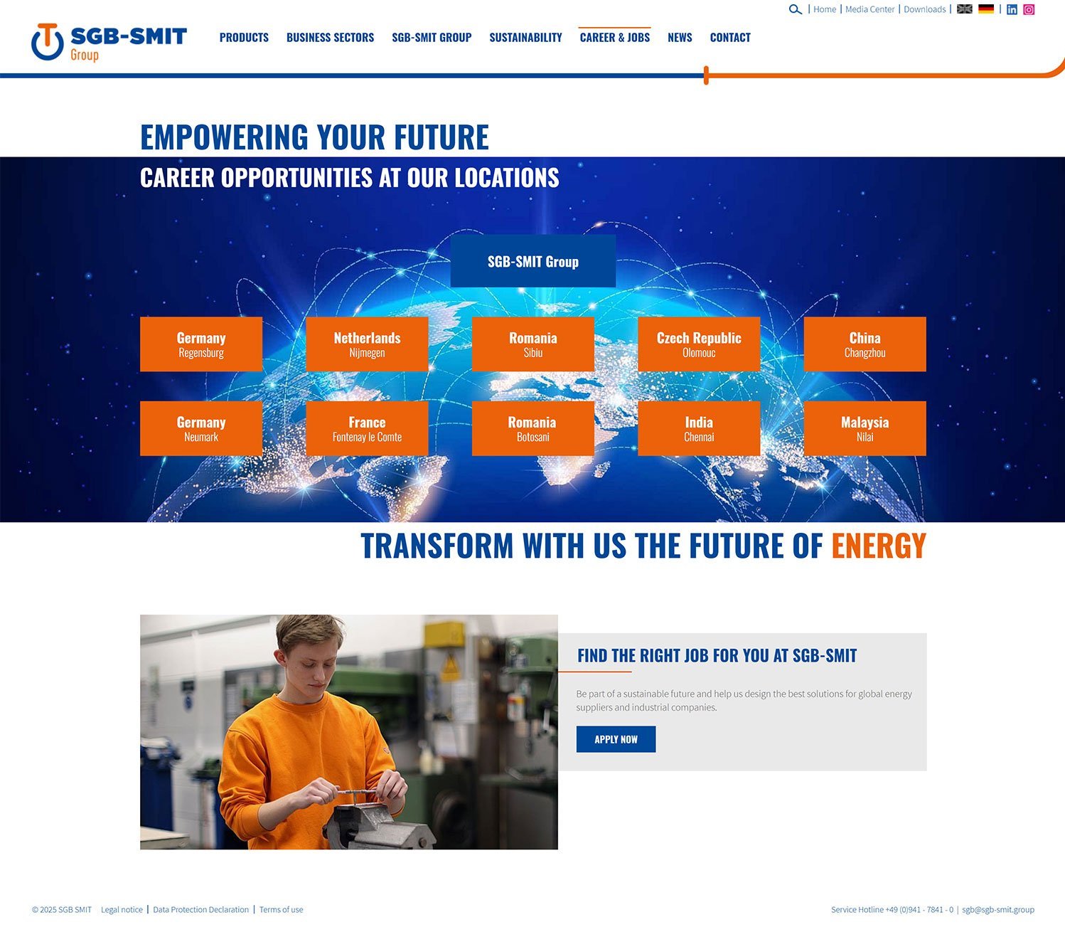 Energieversorger und Industrieunternehmen auf der ganzen Welt vertrauen auf die Produkte der SGB-SMIT Gruppe mit Hauptsitz in Regensburg. Rund 3.100 Mitarbeiterinnen und Mitarbeiter produzieren weltweit an 14 Standorten Transformatoren für Hoch- und Mittelspannungsnetze. Die SGB-SMIT Gruppe ist heute der führende mittelständische Transformatorenhersteller in Europa und spielt damit eine wichtige Rolle bei der sicheren und zuverlässigen Stromversorgung.