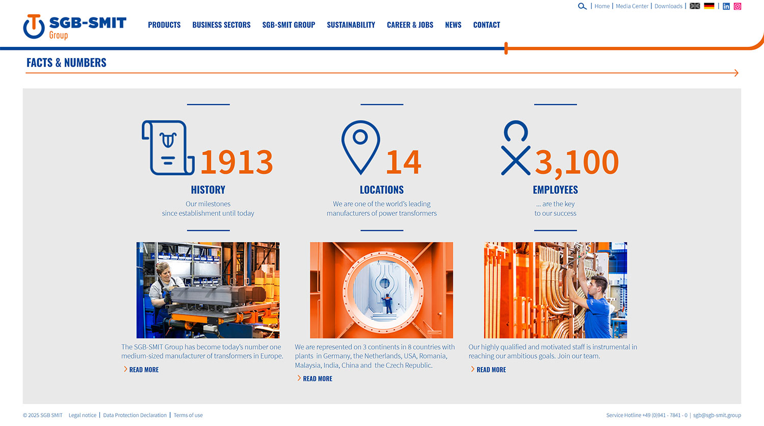 Zusammen mit dem Marketing und der HR-Abteilung von SGB-SMIT arbeitet CONCEPTNET sowohl gestalterisch als auch technisch kontinuierlich an der Internetpräsenz des Unternehmens. Neben der Darstellung des Unternehmens und seiner Produkte gewinnt dabei das Personalmarketing zunehmend an Bedeutung. Auf Basis von TYPO3 haben wir neben dem öffentlichen Auftritt eine Intranet- sowie eine interne Telefonbuch-Lösung umgesetzt. Außerdem haben wir ein Bestellsystem für Gießharz-Transformatoren entwickelt und implementiert.