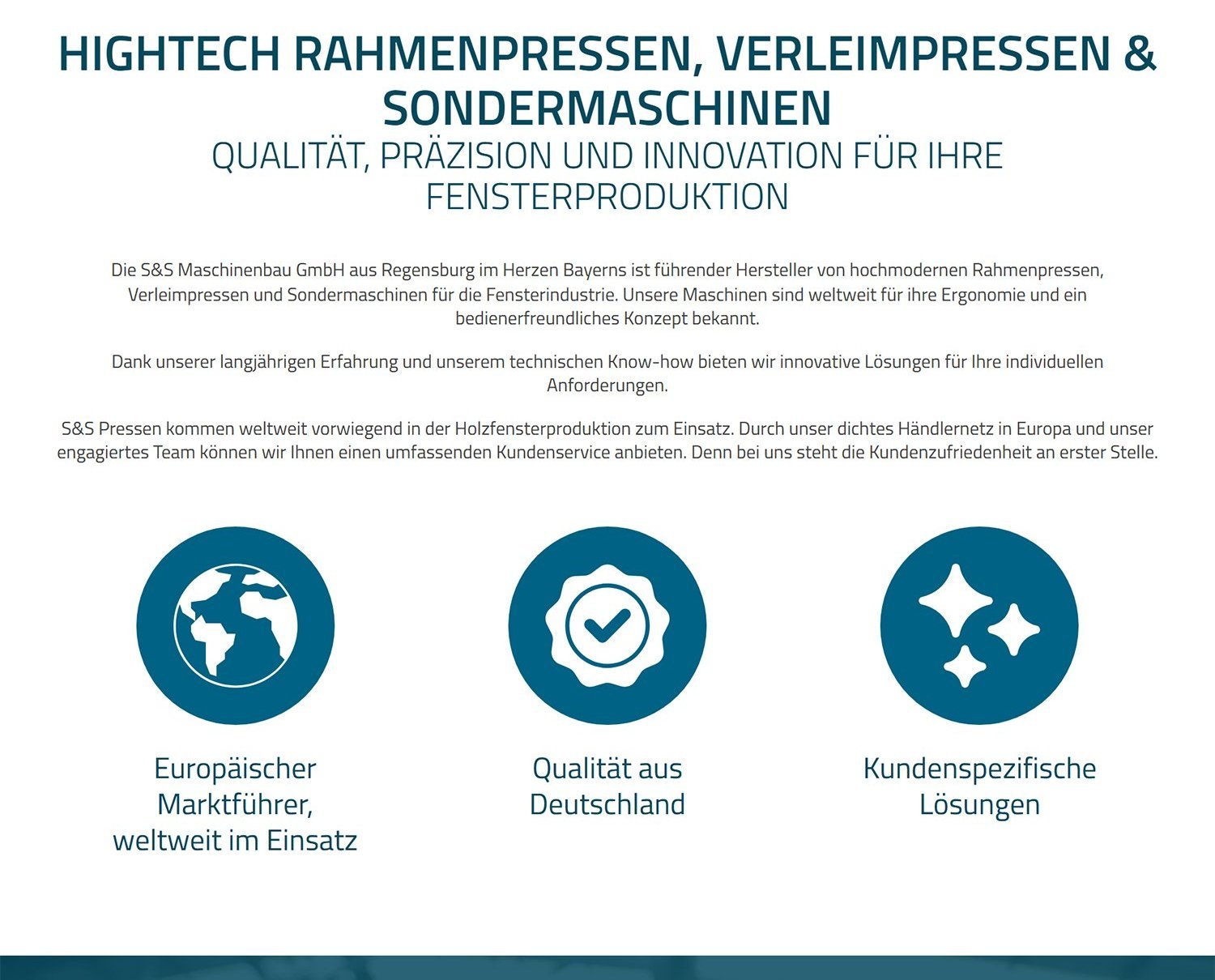 Die S&S Maschinenbau GmbH aus Regensburg, gegründet 1968, ist ein führender Hersteller von hochmodernen Rahmen- und Verleimpressen sowie Sondermaschinen, die vor allem in der Fensterindustrie und Holzfensterproduktion weltweit eingesetzt werden.