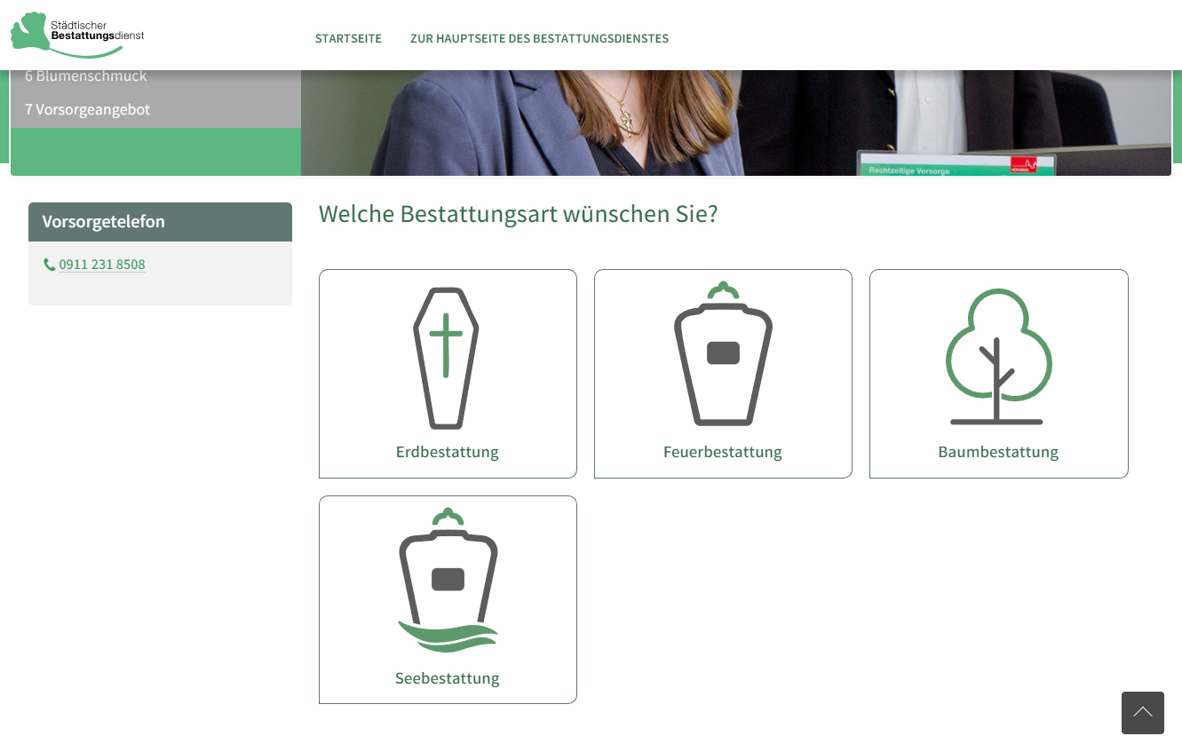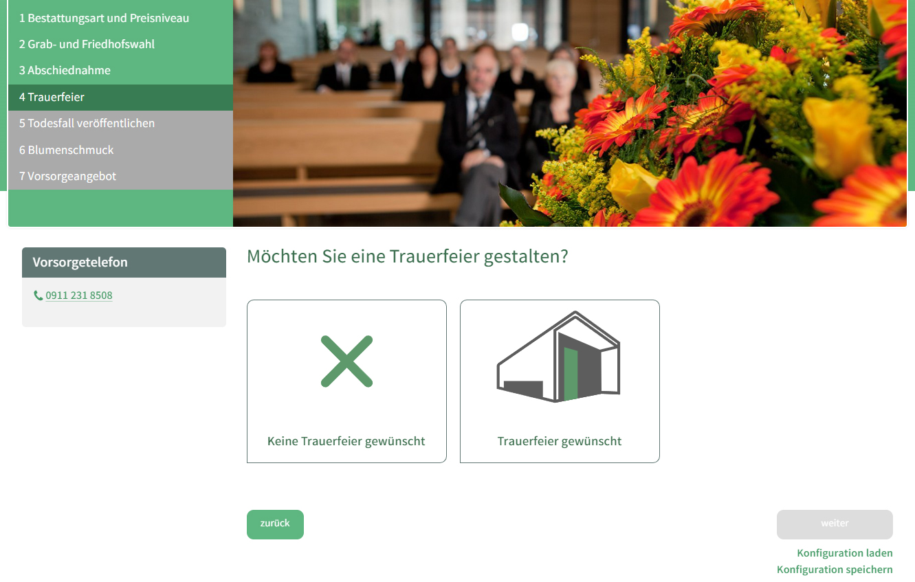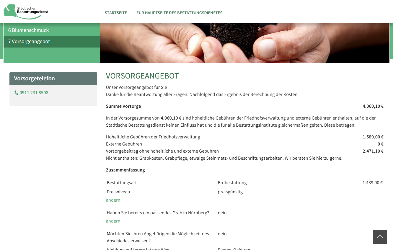 CONCEPTNET durfte für den Städtischen Bestattungsdienst einen Bestattungsvorsorge-Konfigurator entwickeln. Dieser wurde im Rahmen einer TYPO3-Website gestaltet, umgesetzt und wird auf unseren Servern gehostet.
