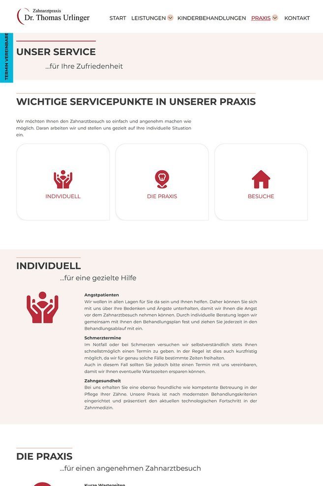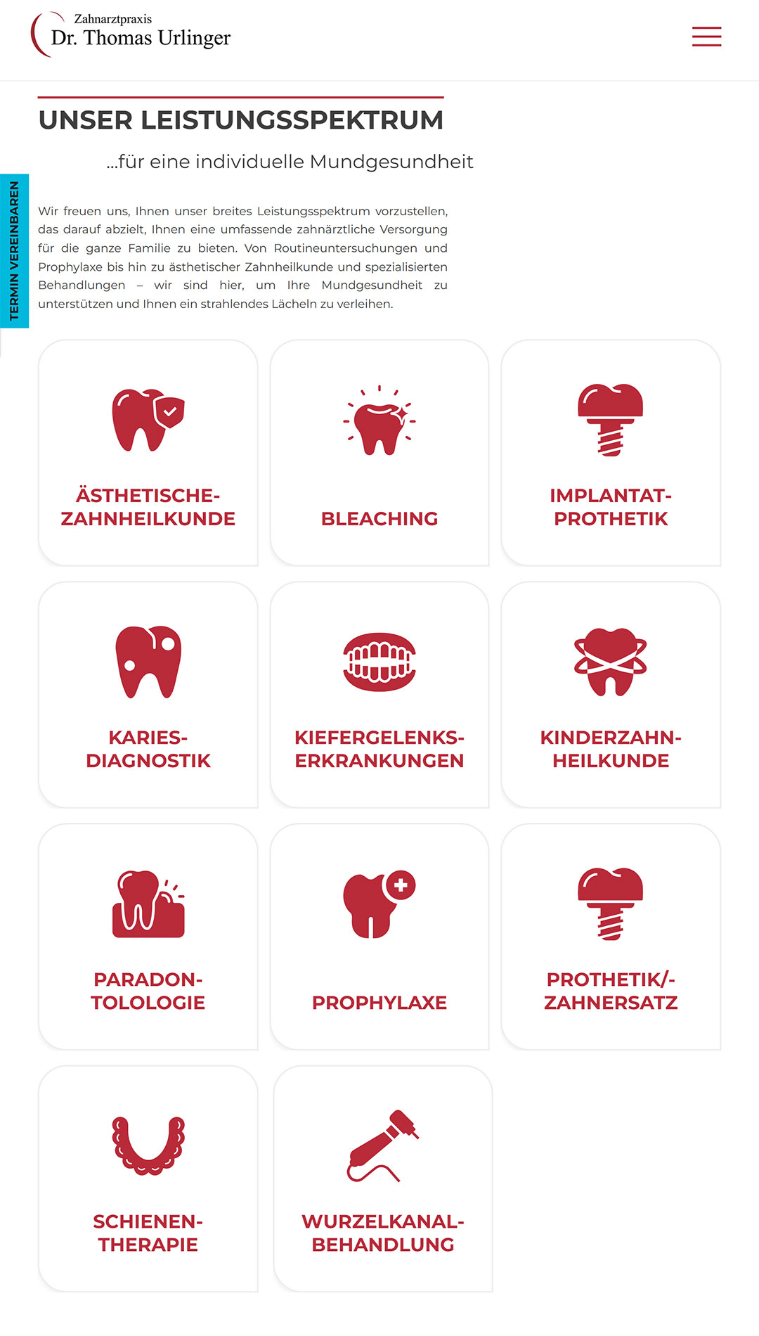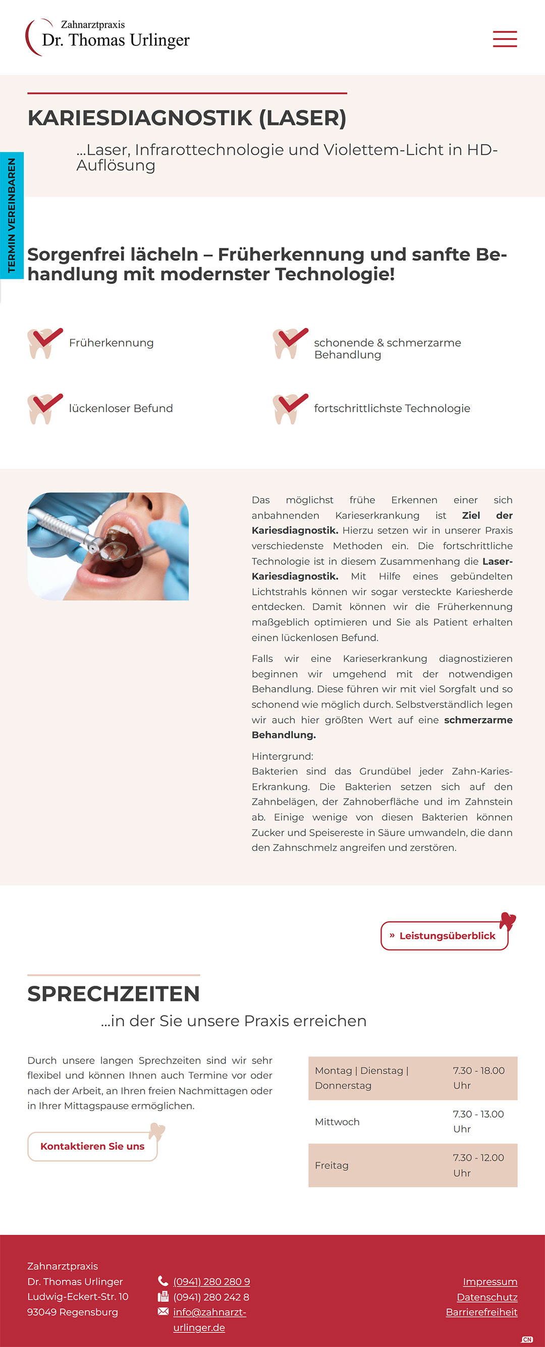 Die Zahnarztpraxis Praxis Dr. Thomas Urlinger in Regensburg bietet ein umfassendes Leistungsspektrum von Prophylaxe über ästhetische Zahnheilkunde bis hin zu Implantatprothetik und Kinderzahnheilkunde. Die Zahnarztpraxis legt Wert auf kurze Wartezeiten, individuell betreute Behandlungen und moderne Technik — von Laser-Kariesdiagnostik bis zur Online-Terminvergabe.